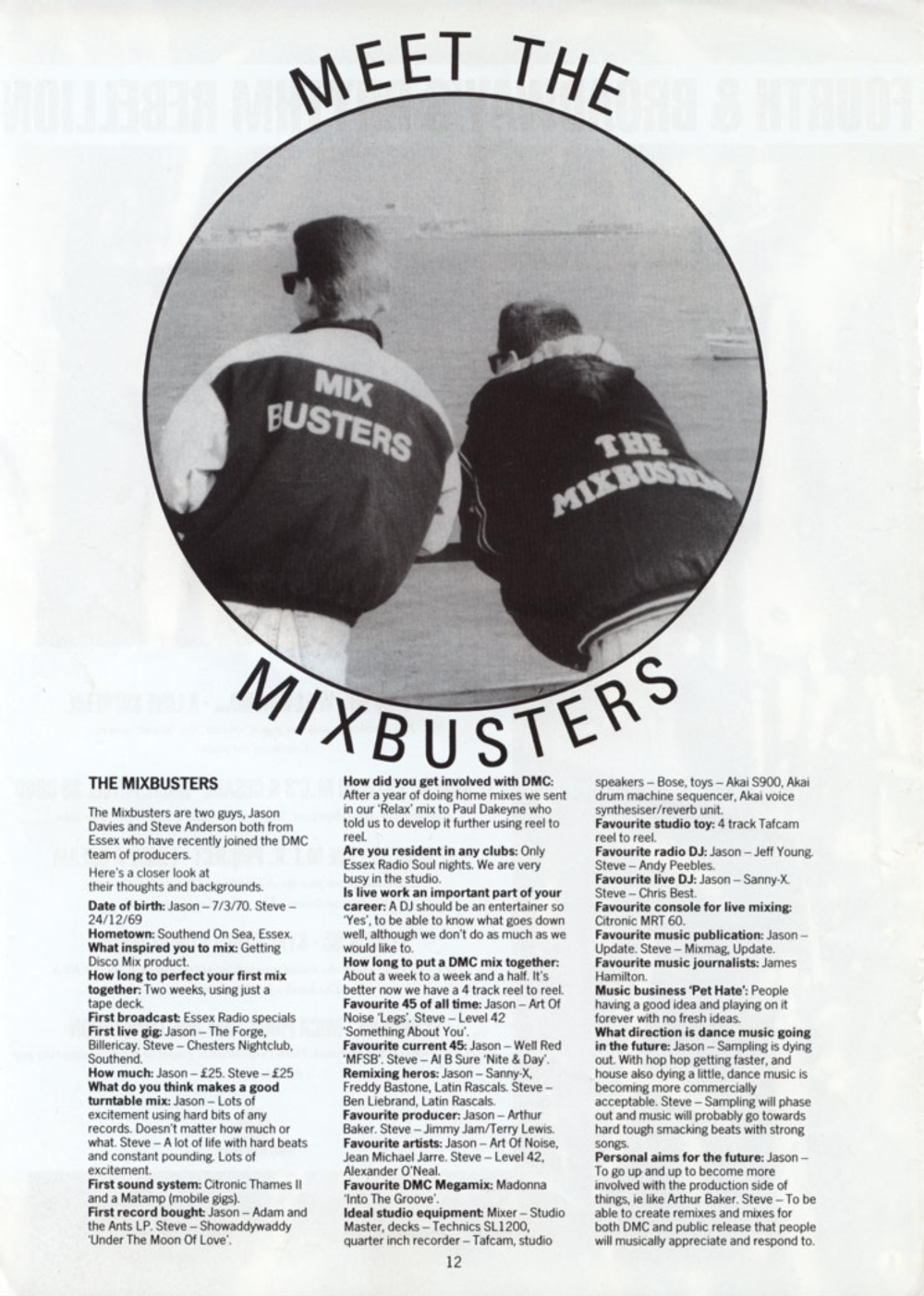 The Mixbusters were the U.K. duo Jason Davies and Steve Anderson and they are one of my favourite mixing teams. They created a number of megamixes and remixes for D.M.C. between April 1988 and April 1989, as well as some bootleg megamixes.