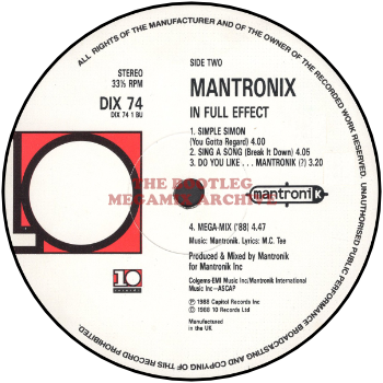 Mantronix - Get Stupid Part III (1988); Mantronix - Sing A Song (Break It Down) (1987); Mantronix - In Full Effect (1988); Mantronix - Do You Like... Mantronik? (1988); Mantronix - Gangster Boogie (Walk Like Sex... Talk Like Sex) (1988); Mantronix - Simple Simon (You Gotta Regard) (1988); Mantronix - Join Me Please... (Home Boys-Make Some Noise) (1988)