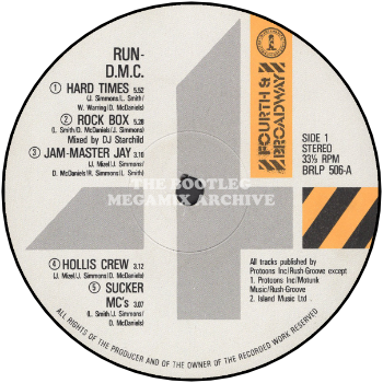 Most tracks have already been reviewed on longer 12in off their first US smash LP ‘Run-D.M.C.’ (US Profile PRO-1202), which for comparison has the 103bpm ‘Sucker M.C.’s (Krush-Groove 1)’, 99⅔bpm ‘Hollis Crew (Krush Groove 2)’, 121bpm ‘It’s Like That’, 99bpm ‘Jam-Master Jay’, 119½bpm ‘Wake Up’, 119⅓bpm ’30 Days’, 119⅘bpm ‘Hard Times’, 106⅚bpm ‘Jay’s Game’, 100⅓bpm ‘Rock Box’.