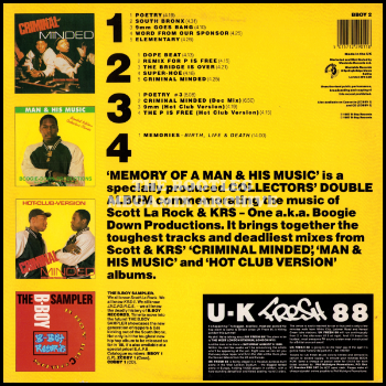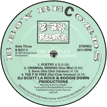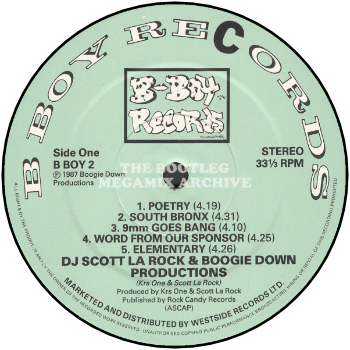 Boogie Down Productions - Word From Our Sponsor (1987); Boogie Down Productions - Dope Beat (1987); Boogie Down Productions - The Bridge Is Over (1987); Boogie Down Productions - Criminal Minded (1987); Boogie Down Productions - South Bronx (1986); Boogie Down Productions - Poetry (1987); Boogie Down Productions - Super Hoe (1987); Boogie Down Productions - Elementary (1987); Scott La Rock & The Celebrity Three - Advance (1986); Boogie Down Productions - Remix For P Is Free (1987); Boogie Down Productions - 9mm Goes Bang (1987); Just-Ice - Going Way Back (1987)