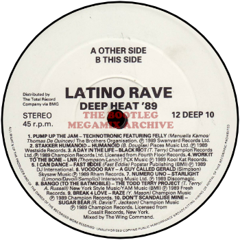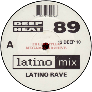 LATINO RAVE ‘Deep Heat ’89 (Latino Mix)’ (Deep Heat 12 DEEP 10), extraordinarily untidy jerkily sequenced 123¼-122¾-124-122¾- 116½-124¾-118½-119-125bpm megamix of Italo, acid and even rap hits, with more of the same on the 118½-122-119-123-124½-117-121¼bpm flip