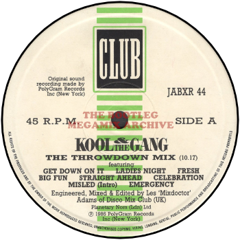 Phonogram have given up with ‘Victory’, replacing the A-side of Kool & The Gang’s 12 inch with ‘The Throwdown Mix‘ (Club JABXR 44), a typical neat 111…124½bpm Les Adams megamix of ‘Get Down On It/Ladies Night/Fresh/Big Fun/Straight Ahead/Celebration/Misled/Emergency’ – in fact, all the hit floor-fillers that fit, nicely timed for Christmas!