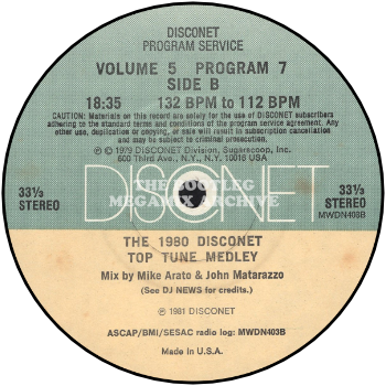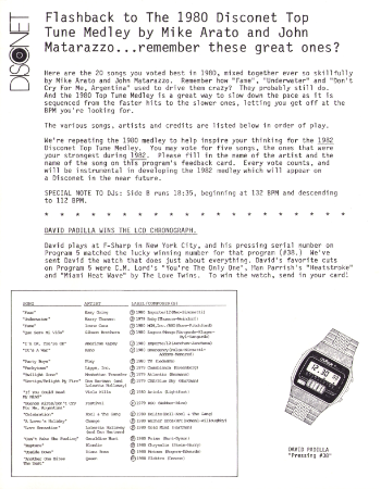 Here are the 20 songs you voted best in 1980, mixed together ever so skillfully by Mike Arato and John Matarazzo. Remember how "Fame", "Underwater" and "Don't Cry For Me, Argentina" used to drive them crazy? They probably still do. And the 1980 Top Tune Medley is a great way to slow down the pace as it is sequenced from the faster hits to the slower ones, letting you get off at the BPM you're looking for. The various songs, artists and credits are listed below in order of play. We're repeating the 1980 medley to help inspire your thinking for the 1982 Disconet Top Tune Medley. You may vote for five songs, the ones that were your strongest during 1982. Please fill in the name of the artist and the name of the song on this program's feedback card. Every vote counts, and will be instrumental in developing the 1982 medley which will appear on a Disconet in the near future.