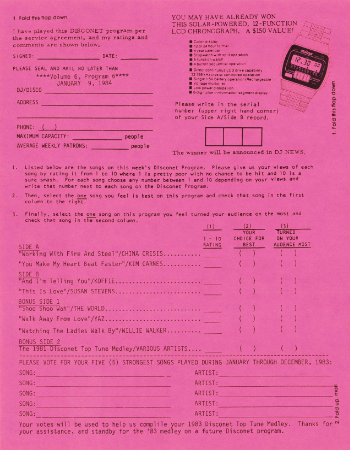 In early 1982, we asked you to vote for your best songs of 1981. These were put together rather eloquently by Mike Arato, John Matarazzo and Raul A. Rodriguez. We're repeating the songs you made the hits of 1981 in this issue to inspire your thinking for the 1983 medley (plus medlies like this are fun occasionally, especially during the holidaze!) It's a real trip into a musical era marked by some signs of change, but basically, the classic sounds made popular in the late 1970s still predominated the dance music of 1981. Who knows what the 1983 medley will sound like? That's up to you! There's special space at the bottom of this program's feedback card. You may vote for five (5) songs. They don't have to be in order… just the five songs that you found were your strongest during January through December of 1983. We'll be back at you in a future issue with your 1983 Disconet Top Tune Medley, so stay tuned.