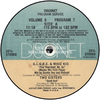G.L.O.B.E. & Whiz Kid - Play That Beat Mr. D.J. (1983); Spoonie Gee meets The Sequence - Monster Jam (1980); James Brown - Soul Power (1971); Malcolm McLaren - Hobo (Scratch) (1983); Funky 4 + 1 - That's The Joint (1980); Konk - Cylinder Re-Cycle (1982); Yazoo - Situation (1982); Malcolm McLaren - Jive My Baby (1983); Michael Viner's Incredible Bongo Band - Apache (1973); Malcolm McLaren & The World's Famous Supreme Team - D'ya Like Scratchin' (1983); Culture Club - I'll Tumble 4 Ya! (1983); Rufus Thomas - Tutti Frutti (1974); Betty White - Bunny Hop (1960); Herbie Hancock - Rockit (1983); Malcolm McLaren & The World's Famous Supreme Team - Buffalo Gals (1982); Supremes - Stop! In The Name Of Love (1965); Grandmaster Flash - The Adventures Of Grandmaster Flash On The Wheels Of Steel (1981); Kurtis Blow - Party Time (1983); Bohannon - Start The Dance (Inserts) (1981); Peech Boys - Don't Make Me Wait (1982); Afrika Bambaataa & The Soul Sonic Force - Planet Rock (1982); Indeep - Last Night A D.J. Saved My Life (1982); Konk - Konk Party (1982)