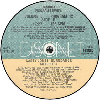 Casey Jones' Eurodance Medlies 1 and 2 spotlighted trends in dance music from Europe, many of which became part and parcel of U.S. dance and pop music as new sounds and techniques won favor with the general public. Casey began spinning in Texas in 1975, and moved to New York at the end of 1979. He's now a regular at New York's new music Panache club, and makes occasional guest appearances in Texas (like last spring's Mardis Gras-like celebration at San Antonio's Bonham Exchange.) Casey also works at Vinyl Mania, a leading new music store in New York which regularly breaks imports. He's assembled five 12" imports into a set which brings perspective to much of what is happening. Each song, according to Casey, has not received the exposure it merits, as the glut of 12" product from the majors, a continuing flow of independent product, and a very strong dollar (which means that imports are 40% less expensive in the U.S. than they were a few years ago) has led to more songs reaching out for listeners than there is time to absorb. Parking Meters leads of Casey's set, with "Cross My Heart" from their BMC/Belgium release. Herwig Duchateau produced the song with the group, and did the remix. The Bridge is next, with "Love Dance." Their Second Vision/UK 12" comes with two mixes (industrial and love), and was produced by Paul Bell. Foreign Press follows, with "The Great Divide" from their EMI/UK 12". The Do Jo Be Music Production comes in two versions on the commercial release, along with a second song called "Love In A Strange Place." Seona Dancing is next with "Bitter Heart", from their London/UK 12". Phil Thornalley produced, and the song is backed with "Tell Her" on the commercial release. Hazel O'Connor completes the set with "Don't Touch Me", from her RCA/UK EP produced by Martin Rushent and Neil O'Connor. As with most of this set, Casey has combined vocal and instrumental portions to get an overall flow going. The overall texture of Eurodance 3 is very serious music, with a wide use of Linn and other synthesized drums and regular breaks into electronic riffs which predominate much of today's street music in the states. But the Europeans go farther in their use of melody and harmony, and are leading the way towards making electronic chips sound like real music.