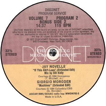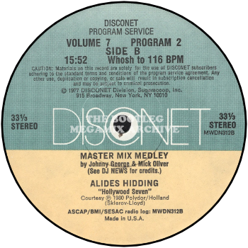The vivid imagination and golden blades of Indianapolis and Chicago club DJs Johnny George and Mick Oliver originally fired up dance floors in 1980 when their classic "Master Mix Medley" was programmed on Disconet. If you're new to playing, Johnny and Mick provide an excellent sampling of the best of 1979 and 1980 from Queen's "Another One Bites The Dust" to John Davis' "Ain't That Enough For You." We continue to receive requests for an encore presentation of this set, so here it is to complete our 'summer reruns' this season with the high energy party spirit that reflects the dance music of late 1979/early 1980. The set goes right into "Hollywood Seven" by Alides Hidding. This Polydor single made some waves in Europe in 1980, and remains today a melodic, Harry Chapinlike ballad of a girl from Omaha who tried to make it in Hollywood.