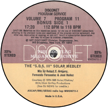 Here's a great dance-oriented compilation of 20 of the great songs which Solar has released over the past seven years. Dick Griffey started the label as an acronym for "Sound Of Los Angeles Records", and after a stint via RCA's distribution, Solar is now with Elektra. Produced largely by Leon Sylvers, with Dick as exec producer, Solar developed into the modern-day Motown with a tight group of professionals creating some of today's finest r&b music. The "S.O.S. III" (the record pool's namesake, or, Surgeons Of Sound when they're doing special mixes) have done a great job at showcasing seven years of hits into one very danceable set. Robert F. Gregory, head of the S.O.S. Pool, has been a professional D.J. for nine years. Jose Nunez has been playing for four years at various NY area clubs, and specializes in editing. Fernando Fernandez, the third of The III, has been spinning for eight years and currently plays at Lismar. Gabriel Posada engineered on an eight track machine to get some of those nice special effects. Enjoy!