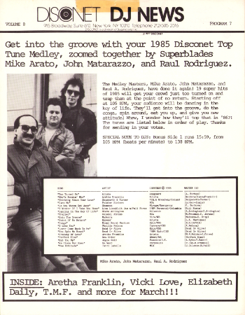 The Medley Masters, Mike Arato, John Matarazzo, and Raul A. Rodriguez, have done it again! 19 super hits of 1985 will get your crowd just too turned on and trap them at the point of no return. Starting off at 105 BPM, your audience will be dancing in the key of life. They'll get into the groove, do the conga, spin around, eat you up, and give you new attitude! Whew, I wonder how they'll top that in '86?! The tunes are listed below in order of play. Thanks for sending in your votes.