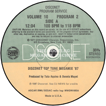 Sparking off Disconet's Year End Explosion is the 1987 Top Tune Megamix, produced by Tuta Aquino and Dennis Muyet. Although I didn't count the edits this time, you're sure to be amazed. So put the needle to the record and watch your crowd go into a full circle. Thanks for all those edits guys!!!!