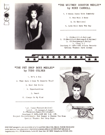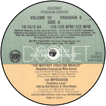 Sparking off Disconet's July program celebration is "The Whitney Houston Medley". This Megamix of Whitney's hottest dance tunes ("I Wanna To Dance With Somebody", "How Will I Know", "So Emotional", and "Love Will Save The Day") was produced by Disconet's Golden Razor Blade, Mike Carroll. From start to finish this captivating Megamix is a non-stop explosion of firecracker edits, exploding breaks, and crowd pleasing screamers. The excitement continues with "Forbidden Lover" by 1st. Impression, on Arista Records. Ned Bannan and Chris Walsh of KISS FM Hartford Ct., have teamed up to create a special Disconet version of this exciting floor packing, percussive dance tune.