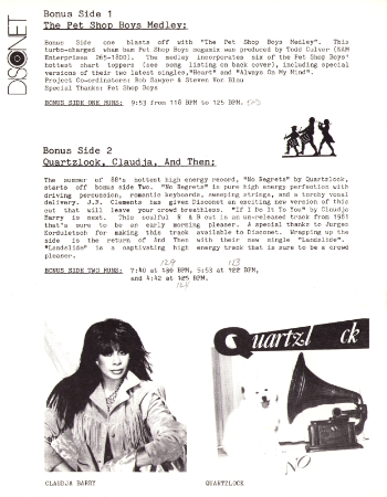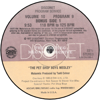 Bonus Side one blasts off with "The Pet Shop Boys Medley". This turbo-charged wham bam Pet Shop Boys megamix was produced by Todd Culver (NAM Enterprises 265-1800). The medley incorporates six of the Pet Shop Boys' hottest chart toppers, including special versions of their two latest singles,"Heart" and "Always On My Mind". Project Co-ordinators: Rob Sawyer & Steven Von Blau. Special Thanks: Pet Shop Boys