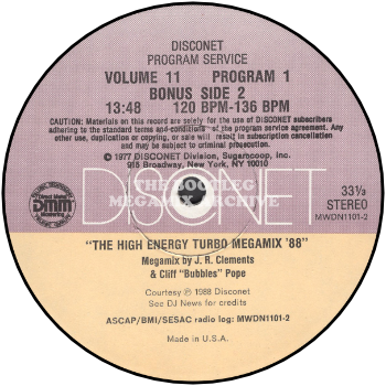 Bonus Side 2 blasts off with "The High Energy Turbo Megamix '88." This unparalleled non-stop megamix of twelve of this year's biggest high energy club hits was created masterfully by J.R. Clements and Cliff "Bubbles" Pope. This turbo megamix will electrify your crowd from start to finish. So put the needle to the record and just say yo.
