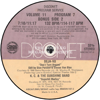 Next is the classic Disconet K.C. & The Sunshine Band "Superhit Medley." All the cuts are from the legendary TK Records catalogue. These include: "Get Down Tonight," "Shake Your Booty," "I Like To Do It," "Keep It Comin' Love," "That's The Way (I Like It)" and "I'm Your Boogie Man."