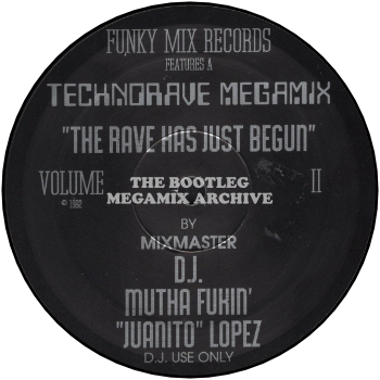 RUNOUT GROOVES: TRM-02-1 L-39412 FUNKY MIX IS BACK IN 1992 WITH A HIGHLY ENERGETIC MEGA MIX CALLED "THE RAVE HAS JUST BEGUN" BY MIXMASTER "D.J. JUANITO" AKA "SKARFACE" ...DON'T FUCK WITH ME, MAN! FUNKY MIX RECORDS LOS ANGELES (Side A) TRM-2 L-39412X (Side B)