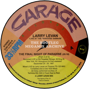 COMMENTS: According to the label, this was recorded live at The Paradise Garage throughout its final weekend of September 25-28, 1987. It was mixed live by Larry Levan on Thorens TD-125 MKII Turntables and a Urei 1620 Mixer. All delays were performed courtesy of a Technics RS-1500 2-Track reel to reel.