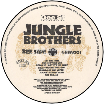 Gee St Recordings’ UK version of the Jungle Brothers’ ‘Straight Out The Jungle’ (GEEA001) adds to the album’s originally reviewed tracks the Richie Rich reconstructed ‘I’ll House You’ hit, plus, with the first 5,000, a bonus 12 inch containing a ‘Because I Got It Like That’ (and thus also Sly Stone) based 0-108-107⅚bpm Ultimatum’s Ultramix, flipped by its chuggingly drummed 107⅚bpm Jungle Beats and brief Jungle Bass