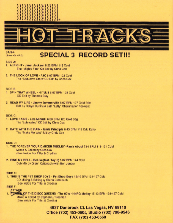 Evelyn Thomas - High Energy (1984); Viola Wills - If You Could Read My Mind (1980); Carol Jiani - Hit 'N Run Lover (1981); Kelly Marie - Feels Like I'm In Love (1979); Gayle Adams - Your Love Is A Life Saver (1980); Carol Jiani - Mercy (1981); Hazell Dean - Searchin' (I Gotta Find A Man) (1983); Inner Life - Ain't No Mountain High Enough (1981); Phyllis Nelson - Don't Stop The Train (1980); Patrick Cowley featuring Sylvester - Do Ya Wanna Funk (1982); Patrick Cowley - Menergy (1981); Patrick Cowley - I Wanna Take You Home (1981); Miquel Brown - So Many Men, So Little Time (1983); Lisa - Jump Shout (1982); ABBA - Lay All Your Love On Me (1980); Phyllis Nelson - Don't Stop The Train (1980); Laura Branigan - Gloria (1982); Donna Summer - She Works Hard For The Money (1983); Lime - Unexpected Lovers (1985); Eria Fachin - Savin' Myself (1987); Cerrone - Trippin' On The Moon (1981); Phyllis Nelson - Don't Stop The Train (1980); Lime - Your Love (1980); Lime - Babe, We're Gonna Love Tonite (1982); Lime - Come And Get Your Love (1982); Patti LaBelle - New Attitude (1984)