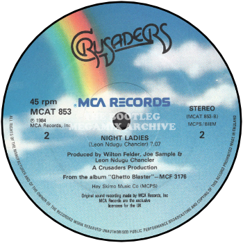 Alan Coulthard neatly blends a marathon medley of the classic Randy Crawford-sung ‘Street Life’ (102-106-108)/Wilton Felder ‘Insight’ (108-109-110)/Joe Sample ‘Burnin’ Up The Carnival’ (109)/’Street Life’ (111-112)/JS ‘There Are Many Stops Along The Way’ (113)/WF ‘Inherit The Wind’ (115)/’Dead End’ (115)/’Street Life’ (115-115½bpm), which rightly takes A-side precedence over the new ghastly chix squawked lurching almost Hi-NRG 126bpm ‘Night Ladies‘ — these same chix also singing their alternative import 12in ‘New Moves‘ (US MCA MCA-13991), which is like a speeded-up 122bpm early Jackson 5 record (dub/edit flip). Their imminent LP on this showing could be a disappointment.