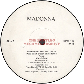 COMMENTS: If you combine the two mixes on this release, they contain all of the elements of the Paul Dakeyne Madonna mix that was on side A of D.M.C. - January 1987 Mixes 2, so I assume this is the full length mix that Paul Dakeyne created and it was then edited for the DMC release.
