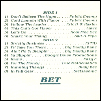 Public Enemy - Don't Believe The Hype (1988); Public Enemy - Cold Lampin' With Flavor (1988); Eric B. & Rakim - Follow The Leader (1988); Latee - This Cut's Got Flavor (1987); Kool Moe Dee - Let's Go (1987); Salt-N-Pepa featuring E.U. - Shake Your Thang (1988)