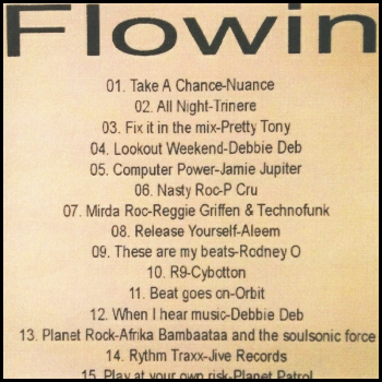Aleem featuring Leroy Burgess - Release Yourself (1984); Rodney-O - These Are My Beats (1985); Cybotron - R-9 (1985); Orbit featuring Carol Hall - The Beat Goes On (1982); Debbie Deb - When I Hear Music (1983); Afrika Bambaataa & The Soul Sonic Force - Planet Rock (1982); Willesden Dodgers – Jive Rhythm Trax 122 B.P.M. (1982); Planet Patrol - Play At Your Own Risk (1982)