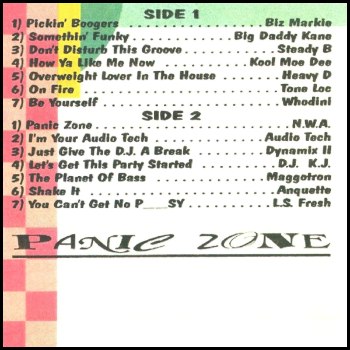 Sir Jinx & Crazy D Freestyle; N.W.A. - Panic Zone (1987); Audio Tech - I'm Your Audio Tech (1987); Dynamix II featuring Too Tough Tee - Just Give The D.J. A Break (1987); D.J. K.J. & M.C. Kooley C - Let's Get This Party Started (1986); Maggotron - Welcome To The Planet Of Bass (1987); Anquette - Shake It (Do The 61st) (1987); L.S. Fresh - You Can't Get No Pussy (1987)