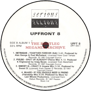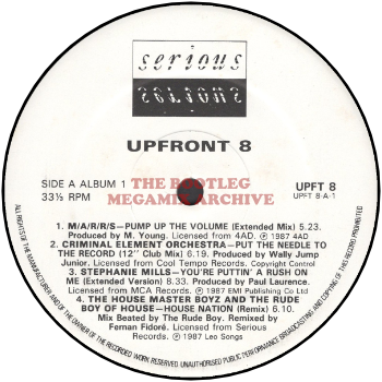 Duane & Co. - Hard Core (On The One) (1987); Cultural Vibe - Ma Foom Bey (1986); Mickey Oliver featuring Tage - Just A Tease (1987); M|A|R|R|S - Pump Up The Volume (1987); Pulse - Shut Up Already! (1987); Housemaster Boyz & The Rude Boy Of House - House Nation (1986); Criminal Element Orchestra - Put The Needle To The Record (1987); Blaze - If You Should Need A Friend (1987); Pleasure Pump - Fantasize Me (1987)