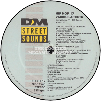 M.C. Mitchski 'The Rappin Comedian' & M.B. 'The Human Radio' - Brooklyn Blew Up The Bridge (1987); 7A3 - 7A3 Will Rock You (1987); King Tee & Mixmaster Spade with The Compton Posse - Ya Better Bring A Gun (1987); C.I.A. - My Posse (1987); Spoonie Gee - The Godfather (1987); Doc Ti - Block Party (1987); B.O.S.E. - Bass Overdrive (1986)