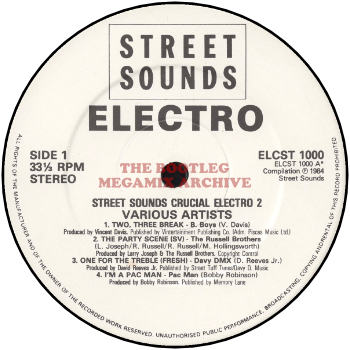 B Boys - Two, Three, Break (1983); Russell Brothers - The Party Scene (1983); Davy D.M.X. - One For The Treble (Fresh) (1984); Packman - I'm The Packman (Eat Everything I Can) (1983)