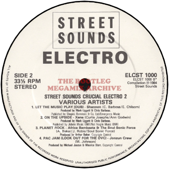 Shannon - Let The Music Play (1983); Xena - On The Upside (1983); Afrika Bambaataa & The Soul Sonic Force - Planet Rock (1982); Jonzun Crew - Pack Jam (Look Out For The O.V.C.) (1982)
