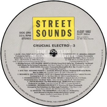 Full Force - Alice, I Want You Just For Me (1985); Original Concept - Can You Feel It? (1986); Whistle - (Nothing Serious) Just Buggin' (1985); Mantronix - Bassline (1985); Roxanne Shante - Bite This (1985); Grandmixer D. St. - Megamix II: Why Is It Fresh? (1984); Chris 'The Glove' Taylor, Dave Storrs, Karlos Z. & Victor Flores - Itchiban Scratch (1985); Newcleus - Jam On Revenge (The Wikki-Wikki Song) (1983); Information Society - Running (1984); Unknown D.J. - 808 Beats (Eight Hundred And Eight Beats) (1984)