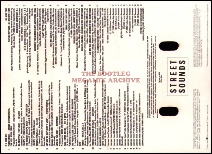 L.A. Dream Team - Rock Berry Jam (1985); Unknown D.J. - 808 Beats (Eight Hundred And Eight Beats) (1984); D.E.F. featuring D.J. Three D - D.E.F. Momentum (1985); World Class Wreckin' Cru - Surgery (1984); Egyptian Lover - Egypt, Egypt (1984); World Class Wreckin' Cru - Juice (1984); Unknown D.J. - Let's Jam (1985); Egyptian Lover - Girls (1984); Uncle Jamm's Army featuring Mr. Prince & Miss Nysa - Naughty Boy (1985); Knights Of The Turntables - Techno Scratch (1984); Knights Of The Turntables - We Are The Knights (1985); Chris 'The Glove' Taylor, Dave Storrs, Karlos Z. & Victor Flores - Itchiban Scratch (1985)