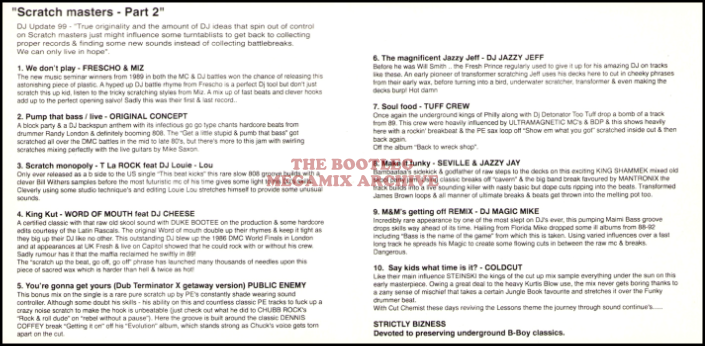 Pinky & Perky with Sid Hadden & His Orchestra - Chitty Chitty Bang Bang (1970); Chuck Brown & The Soul Searchers - Bustin' Loose (1978); Banbarra - Shack Up (1975); Kurtis Blow - Party Time (1983); Pleasure - Celebrate The Good Things (1978); Michael Viner's Incredible Bongo Band - Apache (1973); Hot, Cold Sweat - Meet Me At The Go-Go (1982); Kurtis Blow - The Breaks (1980); Sound Experience - Boogie Woogie (1975); Trouble Funk - Say What? (1983); Trouble Funk - Drop The Bomb (1981); James Brown - Sex Machine Part I And Part II (1975); Fat Boys - Human Beat Box (1984); 'D' Train - Music (1983); Geoff Love & His Orchestra - The Good, The Bad And The Ugly (1969); Afrika Bambaataa & The Soul Sonic Force - Looking For The Perfect Beat (1983); Kool & The Gang - Jungle Jazz (1975); Kool & The Gang - Funky Stuff (1973); Jimmy Castor Bunch - King Kong (1975); Pumpkin & The Profile All-Stars - Here Comes That Beat! (1984); James Brown - Funky Drummer (1970); Louis Prima - I Wan'na Be Like You (1968); Beside - Change The Beat (1982); James Brown - Get On The Good Foot (1972); Grandmaster Flash - The Adventures Of Grandmaster Flash On The Wheels Of Steel (1981); Brother 'D' with Collective Effort - How We Gonna Make The Black Nation Rise? (1985); James Brown - Living In America (1985); Malcolm McLaren & The World's Famous Supreme Team - Buffalo Gals (1982); Trouble Funk - Pump Me Up (1980); Trouble Funk - Let's Get Small (1982); Herman Kelly & Life - Dance To The Drummer's Beat (1978)