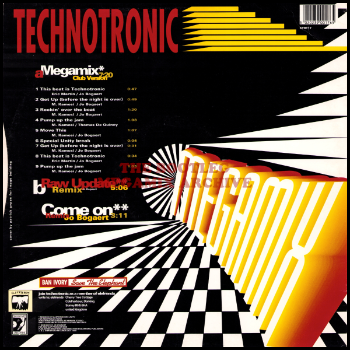 Not apparently mailed to club jocks as it’s ‘product’ for their young pop fans, this is a straightforward greatest hits megamix by Mastermixers Unity of ‘This Beat Is Technotronic/Get Up (Before The Night Is Over)/Rockin’ Over The Beat/Pump Up The Jam/Move This’, flipped by Jo Bogaert’s gruffly muttered chugging ‘Raw Update (Remix)‘ (123¼bpm) and jerkily shuffling ‘Come On (Remix)‘ (121bpm). All Technotronic need now to become the new Boney M are some slower strong songs as well.
