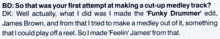 When spotted in New York’s Music Factory record shop there was no knowing this wasn’t as old as the other “interesting” items on display, a Steinski-type 109-110½-102⅔-104⅓-105⅔-105⅓-105⅔-106bpm megamix mainly of James Brown riffs (‘Sex Machine’ included) with other break beats thrown in too, and as flip three different useful breaks for mixers.