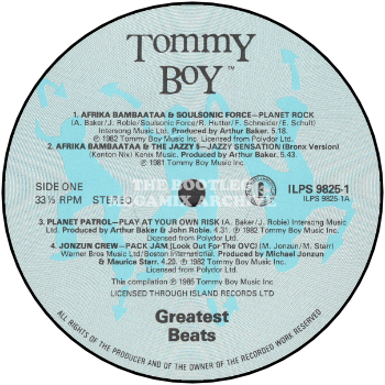 G.L.O.B.E. & Whiz Kid - Play That Beat Mr. D.J. (1983); Beatmaster - Lipservice (1984); Force M.D.'s - Let Me Love You (1984); Afrika Bambaataa & The Soul Sonic Force - Renegades Of Funk (1983); Afrika Bambaataa & The Godfather Of Soul James Brown - Unity (1984); Pressure Drop - Rock The House (You'll Never Be) (1982); Jonzun Crew - Space Cowboy (1983); Afrika Bambaataa & The Soul Sonic Force - Looking For The Perfect Beat (1983); Afrika Bambaataa & The Soul Sonic Force - Planet Rock (1982); Planet Patrol - Play At Your Own Risk (1982); Planet Patrol - Cheap Thrills (1983); Planet Patrol - I Didn't Know I Loved You (Till I Saw You Rock & Roll) (1983); Force M.D.'s - Itchin' For A Scratch (1985)