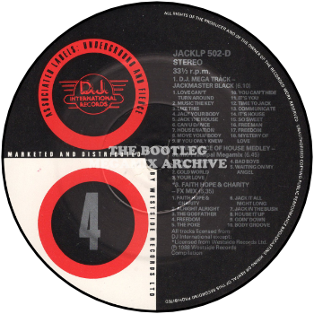 Double album of traditional-type alkaline (rather than acid!) house, tons of it, the soulfully sung 113¾-113½-0bpm TARGA with SHAWN CHRISTOPHER ‘Love Invasion’ and “elephant trumpeting” jittery 0-116bpm MASTERS AT WORK ‘Dum Dum Cry’ being the only exceptions to the norm amongst the 124bpm FAST EDDIE SMITH ‘Jack To The Sound’, 118bpm HOLLYWOOD AND THE HEAT ‘I Need You’, 122bpm ROCKY JONES ‘Choice Of A New Generation’, 121¾bpm JOE SMOOTH ‘Inside My Mind’, 120¾bpm EX-SAMPLE ‘And So It Goes’, 119-0bpm SECRET SECRET ‘We Came To Jack’, 125⅔bpm PROFESSOR FUNK ‘Box Head’, 126bpm ANTHONY THOMAS ‘Promised Land’, 120½-0bpm BLAKE BAXTER ‘Work’, 131½bpm ANDRE OWENS ‘Destiny Of Love’, 124¾bpm THE CHILDREN ‘Brothers Gonna Work It Out’, 0-120¼bpm PETER BLACK ‘My Love Is Free’ – apart, that is, from Colin Faver’s UK-created 0-122½-122⅔-0bpm megamix of FX ‘Faith Hope & Charity’, and the bland girls overdubbed 123⅔bpm JACKMASTER BLACK ‘DJ Mega Track’ and 120½bpm JAMIE PRINCIPAL ‘Prince Of House (Baby Wants To Ride)’ medleys.