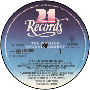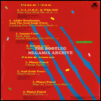 G.L.O.B.E. & Whiz Kid - Play That Beat Mr. D.J. (1983); Afrika Bambaataa & The Soul Sonic Force - Looking For The Perfect Beat (1983); Jonzun Crew - Pack Jam (Look Out For The O.V.C.) (1982); Jonzun Crew - Space Is The Place (1983)