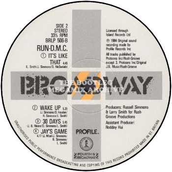 Most tracks have already been reviewed on longer 12in off their first US smash LP ‘Run-D.M.C.’ (US Profile PRO-1202), which for comparison has the 103bpm ‘Sucker M.C.’s (Krush-Groove 1)’, 99⅔bpm ‘Hollis Crew (Krush Groove 2)’, 121bpm ‘It’s Like That’, 99bpm ‘Jam-Master Jay’, 119½bpm ‘Wake Up’, 119⅓bpm ’30 Days’, 119⅘bpm ‘Hard Times’, 106⅚bpm ‘Jay’s Game’, 100⅓bpm ‘Rock Box’.