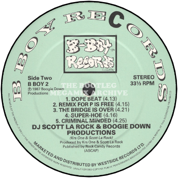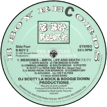Boogie Down Productions - Word From Our Sponsor (1987); Boogie Down Productions - Dope Beat (1987); Boogie Down Productions - The Bridge Is Over (1987); Boogie Down Productions - Criminal Minded (1987); Boogie Down Productions - South Bronx (1986); Boogie Down Productions - Poetry (1987); Boogie Down Productions - Super Hoe (1987); Boogie Down Productions - Elementary (1987); Scott La Rock & The Celebrity Three - Advance (1986); Boogie Down Productions - Remix For P Is Free (1987); Boogie Down Productions - 9mm Goes Bang (1987); Just-Ice - Going Way Back (1987)
