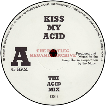 BBH Records claim (although it may be a scam) that just 200 copies have somehow been re-imported of their West Germany consigned pressing of the Mafia megamixed 0-121⅓-122-121½-121¾-122-0bpm WestBam, Adonis, Royal House, Jungle Brothers, D. Mob and many more medleying though Deep House Corporation credited ‘Kiss My Acid (The Acid Hit Mix)‘ (BBH-4) – it certainly could never come out here legally