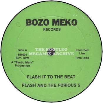 Replacing ‘Feelin’ James’ as hottest bootleg, this simply edited 0-108⅔-105⅔-110⅓-105-109⅓-111⅓bpm mixer alternates between bursts of the Mohawks’ much sought ‘The Champ’ and James Brown’s ‘Get Up, Get Into It, Get Involved’ (rather like Original Concept’s ‘Can You Feel It’) before ending with Dyke & The Blazers’ ‘Let A Woman Be A Woman – Let A Man Be A Man’. The A-side is actually a badly recorded live ‘Flash It To The Beat‘ by (Grandmaster) Flash And The Furious 5.