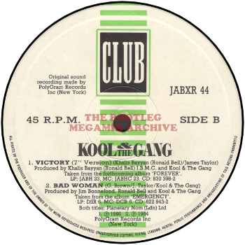 Phonogram have given up with ‘Victory’, replacing the A-side of Kool & The Gang’s 12 inch with ‘The Throwdown Mix‘ (Club JABXR 44), a typical neat 111…124½bpm Les Adams megamix of ‘Get Down On It/Ladies Night/Fresh/Big Fun/Straight Ahead/Celebration/Misled/Emergency’ – in fact, all the hit floor-fillers that fit, nicely timed for Christmas!