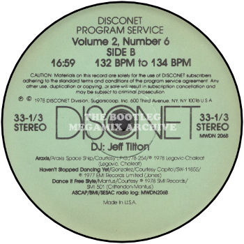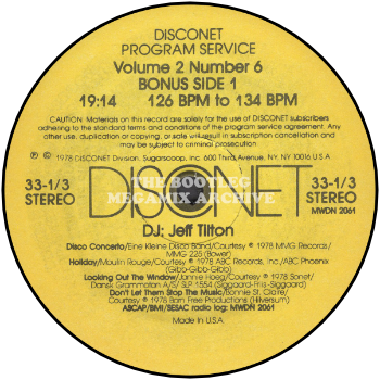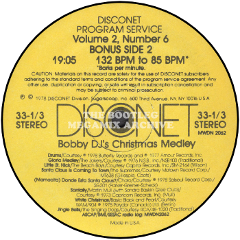 After a minute of super percussion for easy entry, The Jokers start the medley (from N.S.B. in Canada) with "Gloria Medley." Next, backed by the DISCONET rhythm section, it is actually the real Beach Boys' Capitol classic, "Little St. Nick." The Supreme "Santa Claus Is Coming To Town", from their 1965 Motown classic, were also reincarnated for the dance floor. Charo's very upbeat "Mamacita, Donde Esta Santa Claus?" is next, produced by Tom Moulton on Salsoul. "Santa Fly", by Martin Mull on Capricorn really gets down (and who can believe this is sung and written by the host of "Fernwood 2-Night".) Basic Black and Pearl do their get down version of "White Christmas" from Polydor (Canada), and then for the braver DJs willing to try 85 Barks Per Minute, it's The Singing Dogs with "Jingle Bells" from RCA. Their LP was never completed, as one of the lead singers got hit by a car.