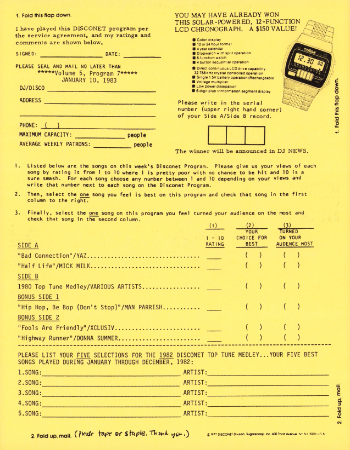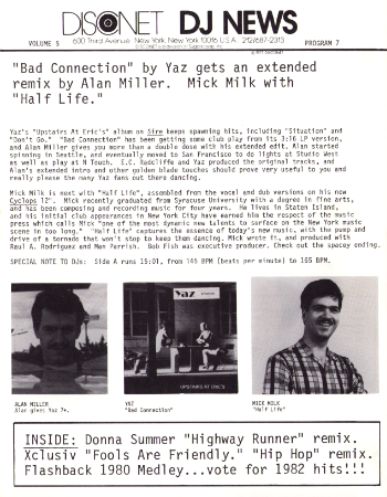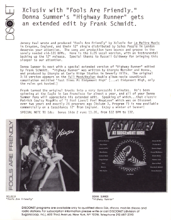 Here are the 20 songs you voted best in 1980, mixed together ever so skillfully by Mike Arato and John Matarazzo. Remember how "Fame", "Underwater" and "Don't Cry For Me, Argentina" used to drive them crazy? They probably still do. And the 1980 Top Tune Medley is a great way to slow down the pace as it is sequenced from the faster hits to the slower ones, letting you get off at the BPM you're looking for. The various songs, artists and credits are listed below in order of play. We're repeating the 1980 medley to help inspire your thinking for the 1982 Disconet Top Tune Medley. You may vote for five songs, the ones that were your strongest during 1982. Please fill in the name of the artist and the name of the song on this program's feedback card. Every vote counts, and will be instrumental in developing the 1982 medley which will appear on a Disconet in the near future.