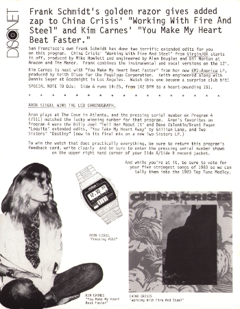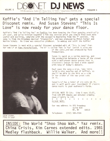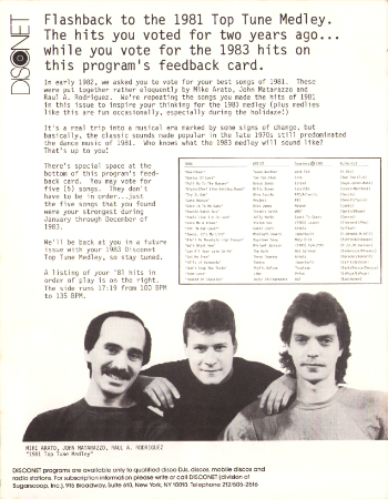 In early 1982, we asked you to vote for your best songs of 1981. These were put together rather eloquently by Mike Arato, John Matarazzo and Raul A. Rodriguez. We're repeating the songs you made the hits of 1981 in this issue to inspire your thinking for the 1983 medley (plus medlies like this are fun occasionally, especially during the holidaze!) It's a real trip into a musical era marked by some signs of change, but basically, the classic sounds made popular in the late 1970s still predominated the dance music of 1981. Who knows what the 1983 medley will sound like? That's up to you! There's special space at the bottom of this program's feedback card. You may vote for five (5) songs. They don't have to be in order… just the five songs that you found were your strongest during January through December of 1983. We'll be back at you in a future issue with your 1983 Disconet Top Tune Medley, so stay tuned.
