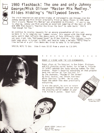 The vivid imagination and golden blades of Indianapolis and Chicago club DJs Johnny George and Mick Oliver originally fired up dance floors in 1980 when their classic "Master Mix Medley" was programmed on Disconet. If you're new to playing, Johnny and Mick provide an excellent sampling of the best of 1979 and 1980 from Queen's "Another One Bites The Dust" to John Davis' "Ain't That Enough For You." We continue to receive requests for an encore presentation of this set, so here it is to complete our 'summer reruns' this season with the high energy party spirit that reflects the dance music of late 1979/early 1980. The set goes right into "Hollywood Seven" by Alides Hidding. This Polydor single made some waves in Europe in 1980, and remains today a melodic, Harry Chapinlike ballad of a girl from Omaha who tried to make it in Hollywood.