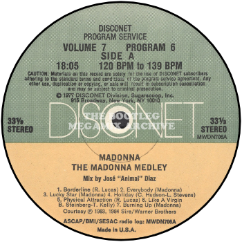 Madonna was born in Bay City, Michigan (near Detroit) 24 years ago, and after singing and dancing through high school, she enrolled at the University of Michigan on a dance scholarship. But the Big Apple called, and she started playing with a series of loft and garage bands around the city in 1978. After five years of polishing her writing and singing abilities with a brief stint in Paris, Seymour Stein signed her to Sire Records and in July, 1983 her first LP entitled "Madonna" was released. The album started slowly, but built faithful followers for Madonna first in the clubs, and then with black radio, and then with the general public as it went double platinum a year later. And now her second LP, titled "Like A Virgin", is taking off like a bat out of hell, fueled by nothing but excellent material, production, and singing. José "Animal" Diaz, who keeps them jumping at Panache in Fairview, NJ, has put together seven of Madonna's superhits into a special Disconet medley for you. "Borderline", produced by Reggie Lucas, starts if off, followed by "Everybody", produced by Mark Kamins. "Lucky Star" follows, and then it's "Holiday" produced by John "Jellybean" Benitez. "Physical Attraction", "Like A Virgin" (produced by Nile Rodgers) and "Burning Up" complete the set. Animal's set is superhot, and ends with his famous Animal Yell signature and that wonderful, jovial laugh now sorely missed by New York radio listeners until Hot Tracks' Carlos de Jesus gets back on the air and plays some real music again.
