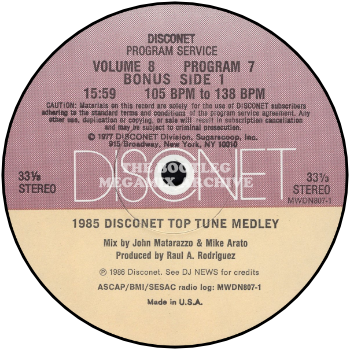 The Medley Masters, Mike Arato, John Matarazzo, and Raul A. Rodriguez, have done it again! 19 super hits of 1985 will get your crowd just too turned on and trap them at the point of no return. Starting off at 105 BPM, your audience will be dancing in the key of life. They'll get into the groove, do the conga, spin around, eat you up, and give you new attitude! Whew, I wonder how they'll top that in '86?! The tunes are listed below in order of play. Thanks for sending in your votes.